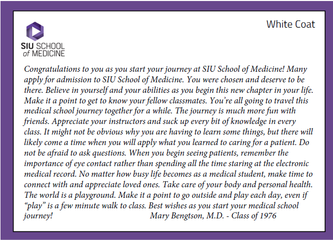 Calendar year 2025 giving totaled $26,050! Thanks to the incredible generosity of our alumni, we fully funded white coats for the Class of 2029 and graduation gowns for the Class of 2026! You showed our students that from day one, the SIU School of Medicine alumni community is invested in their success…thank you! Your $150 gift provides a white coat for an incoming student + a graduation gown for a graduating student.